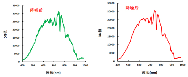 其次是噪声去除,本文运用国外较为常用的最小噪声分离方法(Minimum Noise Fraction Rotation, MNF)进行噪声去除。最小噪声分离工具用于判定图像数据内在的维数(即波段数),分离数据中的噪声,减少随后处理中的计算需求量。MNF本质上是两次层叠的主成分变换。第一次变换(基于估计的噪声协方差矩阵)用于分离和重新调节数据中的噪声,这步操作使变换后的噪声数据只有最小的方差且没有波段间的相关。第二步是对噪声白化数据(Noise-whitened)的标准主成分变换。为了进一步进行波谱处理,通过检查最终特征值和相关图像来判定数据的内在维数。数据空间可被分为两部分:一部分与较大特征值和相对应的特征图像相关,其余部分与近似相同的特征值以及噪声占主导地位的图像相关。由于此次采集的高光谱影像没有白板校正,因此数据预处理的第一步辐射定标没有进行分析处理,直接作MNF降噪分析。图7为MNF降噪前后的成像高光谱数据中DN值的变化。