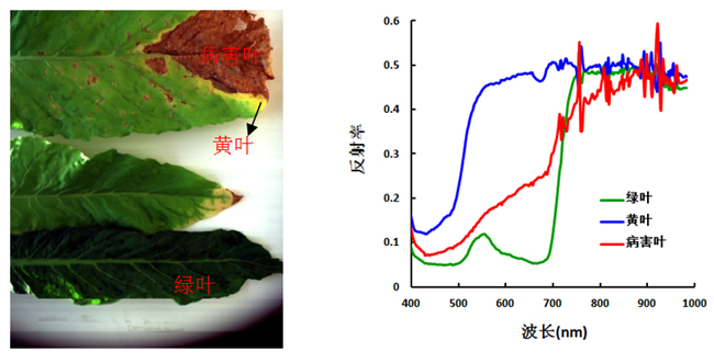 图8 绿叶、黄叶、病害叶的光谱反射率值