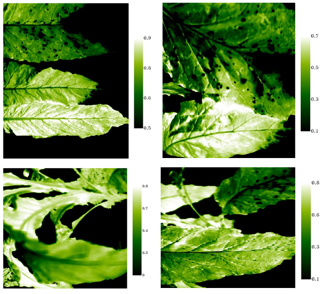 科学研究表明,归一化植被指数NDVI能较好地反映作物的生长状态及其营养是否缺失等。本研究运用近红外800 nm和红光680 nm 构建归一化植被指数以分析提取的作物绿叶生长状态及营养分布情况,如图13。从图13可知,没有病害感染的作物绿叶,其NDVI较高,说明其生长较好;受病害感染的叶片,其NDVI值较低,虽然表面看起来是绿色的,但是其营养已经缺失,随着时间的推移,会变黄,甚至枯萎。