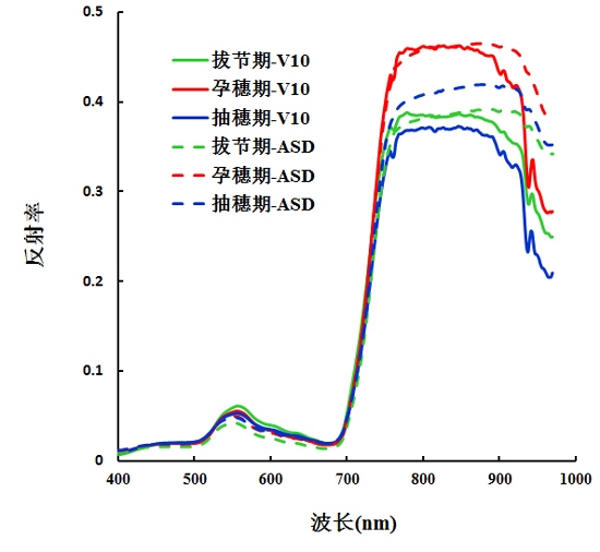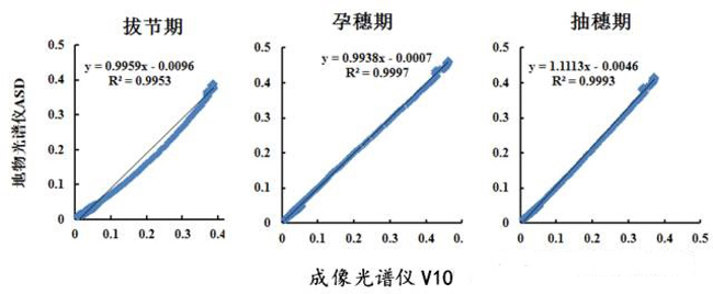 图3不同生育期的成像光谱仪V10和重采样的ASD 光谱反射率的相关性