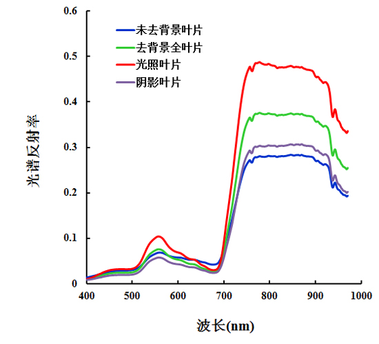 以小麦拔节期的数据为例,成像光谱仪GaiaField-V10获取小麦拔节期的高光谱数据时间为3月13日中午10时-下午14时,天气为晴、无风。图4为小麦高光谱影像未去背景小麦叶片、去背景小麦叶片(包括阴影叶片和光照叶片)、光照叶片和阴影叶片的均值反射率。从图中可知,在可见光区域,去背景之后,小麦叶片的“绿峰”、“红谷”更为显著,去背景小麦叶片的“绿峰”光谱反射率高于未去背景小麦叶片的光谱反射率,“红谷”的反射率则低于未去背景小麦的光谱反射率。由于背景等因素的影响,小麦叶片的红边位置发生了“红移”,在近红外区域,去背景小麦叶片的光谱反射率值高于未去背景小麦的光谱反射率值。有太阳光照射的小麦叶片,无论是可见光还是近红外区域,其反射率值都高于无太阳光照射的小麦叶片,且有太阳照射时,其红边位置发生了“蓝移”。