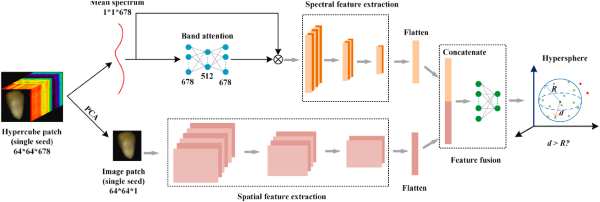 Zhang et al. (2024) 提出了一种基于高光谱成像和深度一类学习(OCL)的玉米种子欺诈检测方法,旨在解决复杂开放场景下未知假品种的识别难题。通过融合高光谱数据的光谱与空间信息,结合波段注意力机制(BAM)抑制冗余波段干扰,构建双分支特征提取网络,并利用最小体积超球体学习策略实现真实品种的*效包裹与假品种的精准拒绝。实验基于20个中国主栽玉米品种数据集,采用光谱(400.8-1000.7 nm)和降维后的单波段空间信息,模型在接收真实品种(ARK)和拒绝假品种(ARU)的准确率分别达到93.70%和94.28%,AUC值为0.9399,显著优于传统OCSVM、孤立森林及深度SVDD等方法。该方法通过端到端网络架构避免了复杂光谱预处理,结合信息融合与注意力机制提升了模型的稳定性和解释性,为种子质量监管及农产品防伪提供了*效、无损的解决方案。