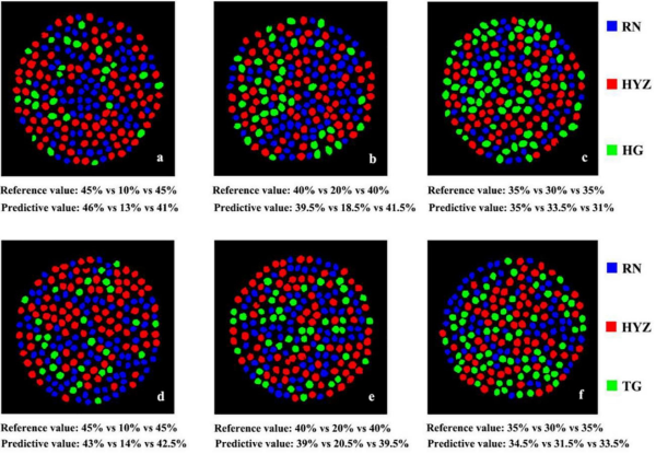 Huang et al. (2022) 该研究结合近红外高光谱成像(HSI)与深度森林(DF)模型,开发了一种快速无损测定高粱纯度的方法。通过孤立森林算法(IF)和主成分分析(PCA)剔除异常数据后,采用竞争性自适应重加权采样(CARS)与连续投影算法(SPA)提取特征波长,并结合灰度共生矩阵(GLCM)获取纹理特征。基于不同数据类型(全光谱、特征光谱、纹理特征及融合数据)构建的DF模型中,特征光谱模型的性能*优,其平均正确识别率(CRR)超过91%,验证集I的平均CRR为88.89%。此外,模型在掺假比例检测中预测偏差小于4%。研究证实,HSI与DF的结合能够*效区分高粱品种并精准评估纯度,为谷物质量的无损检测提供了新策略。高粱掺杂识别可视化如图11所示。