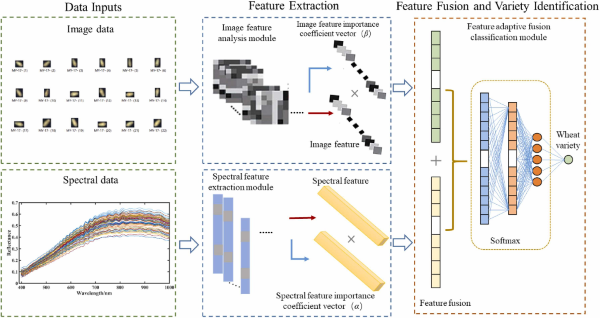 Han et al. (2024) 该研究开发了一种双通道深度学习特征融合模型(DLFM),通过一维卷积模块提取高光谱数据的光谱特征,二维卷积模块提取RGB图像的空间特征,并利用自适应特征融合模块实现多源数据融合(图12)。实验表明,DLFM在三品种、四品种和五品种小麦组合中的识别准确率分别达到99.18%、97.30%和93.18%,平均准确率为92.87%,较传统SVM、1DCNN和2DCNN模型提升显著(最高提升12.54%)。验证集可视化显示,模型能有效区分光谱和纹理特征相似的小麦品种,且预测误差控制在10粒以内。研究证实,DLFM通过自适应融合光谱与图像特征,显著提升了复杂混合场景下的分类稳定性,为谷物品种快速无损识别提供了新方法。