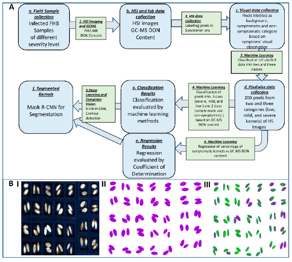 Dhakal et al. (2023) 基于高光谱成像(HSI)与机器学习方法,提出了一种小麦籽粒赤霉病(FHB)损伤及其毒素脱氧雪腐镰刀菌烯醇(DON)含量的无损检测技术。通过对129个小麦品种的田间试验样本(DON含量通过GC-MS测定)进行高光谱数据采集,结合集成学习算法G-Boost和深度学习模型Mask R-CNN,实现了小麦籽粒损伤分类与DON含量的关联分析(图15)。结果表明,G-Boost在光谱特征分类中表现***,训练集准确率达97%,可有效区分健康、低DON(<0.5 ppm)与高DON(>1.5 ppm)籽粒;Mask R-CNN在实例分割中平均精度(mAP)达0.97,结合阈值法(70%病斑像素判定为病粒)后,DON含量与病粒数量回归分析的决定系数(R²)提升至0.75。该研究验证了高光谱成像结合多模态机器学习模型在农业毒素在线检测中的潜力,为粮食加工环节的快速质量评估提供了技术参考。