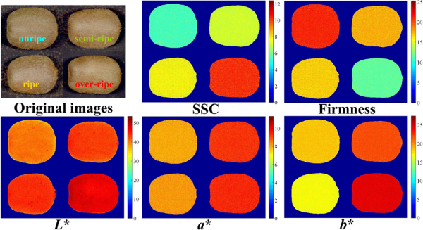 图2.原始RGB图像(a)和猕猴桃中SSC(B)和硬度(c)的分布图(测量值在图的底部)。