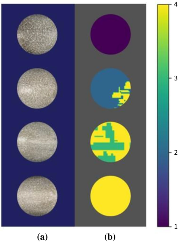 由于猕猴桃采摘后的储存时间短,需要冷藏以延长其成熟和软化时间。为探究贮藏环境对猕猴桃品质的影响,Zhao et al. (2023) 采用高光谱成像(HSI)技术研究了猕猴桃在近红外(NIR)区域不同贮藏条件下的猕猴桃品质变化。他们提出了一种基于深度学习方法对在不同温度(低温和室温)下储存的猕猴桃进行不同时间(0、2、4 和 6 天)的分类。此外,为了进一步研究低温环境下贮藏时间对猕猴桃的影响,采用深度学习方法建立高光谱深度特征与猕猴桃之间的关联,并对猕猴桃的贮藏时间进行分类。分类图可以直观地显示了新鲜水果和低温贮藏水果之间的差异(图3)。