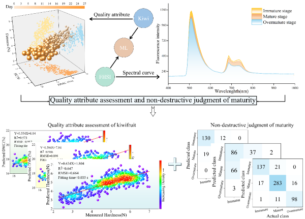 Zou et al. (2024)对红心猕猴桃在开花、结果、成熟和采收过程进行了研究,提出了一种将荧光高光谱成像(FHSI)技术与化学计量学相结合的猕猴桃品质属性评价和成熟度识别的无损方法(图4)。该研究发现随着猕猴桃成熟,FHSI技术捕获的猕猴桃荧光强度逐渐减弱。在猕猴桃品质属性(DMC、硬度和SSC)的预测中,荧光高光谱技术结合PLSR模型准确预测了猕猴桃的内在品质特征。在使用深度学习模型进行猕猴桃成熟度(未熟、成熟和过熟)的三分类中,深度学习相对于机器学习模型具有一定的优势。
