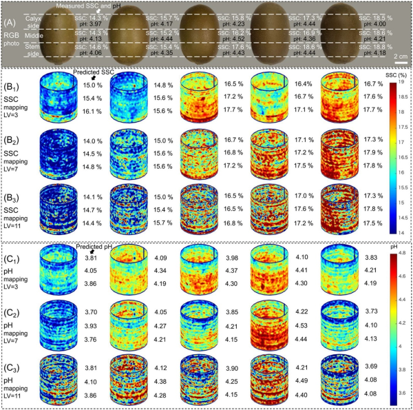 Ma et al. (2021)利用推扫式近红外高光谱成像相机和样品旋转阶段相结合的方法采集了猕猴桃全表面的高光谱数据,这项工作提供了一种非破坏性和快速的方法来可视化猕猴桃的SSC和pH值(图5)。结果表明猕猴桃SSC和pH的360°映射结果超过了这一领域的早期工作,它们在每个完整的样品中显示出不同的空间分布。研究结果表明,对象旋转高光谱成像方法是有前途的非破坏性预测映射的猕猴桃或其他圆柱形样品中的SSC和pH值。