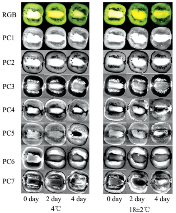货架期是影响果蔬品质和供应安全的重要因素,快速准确预测果蔬货架期已成为消费者、生产者和管理者共同关注的问题。猕猴桃属于呼吸跃变型果实,采后成熟、衰老迅速,极易软化腐烂变质,货架寿命非常有限。但由于猕猴桃表面颜色变化不明显,人们仅凭感官难以准确判断猕猴桃的货架期和质量等级。邵园园 et al. (2020) 近红外高光谱成像技术获取冷藏、室温条件下不同保鲜时间的猕猴桃高光谱信息,结合化学计量学方法,对猕猴桃货架期进行快速预测和判别。对猕猴桃切片图像进行PCA分析,图7为4℃和(18±2)℃的猕猴桃切片PC1-PC7图像。由图中可以看出,PC2图像反映猕猴桃切片信息最 明显,4℃和(18±2)℃的猕猴桃切片PC2图像在各货架期均呈现出不同程度的内部变化。从所得切片信息也进一步验证了高光谱成像技术是实现猕猴桃货架期预测的可靠工具。
