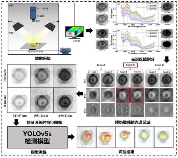猕猴桃在采收、运输和储存过程中,果肉常因碰撞或挤压而碰伤。然而,猕猴桃身上的伤痕肉眼极难识别,被称为隐性损伤。Bu et al. (2024)利用高光谱成像(HSI)与深度学习相结合的方法检测了猕猴桃中隐性损伤(图8)。该研究使用主成分分析 (PCA) 选择对猕猴桃隐藏损伤敏感的光谱范围 (924–1277 nm) 和特征波长(928.19、1051.03和1190.47 nm)。随后,根据猕猴桃特征波长图像生成三通道图像、灰度图像和伪彩色图像,并用于开发检测猕猴桃隐藏的瘀伤区域的 深度学习模型。研究结果表明,深度学习模型HSI技术结合深度学习模型可以有效检测猕猴桃中的隐藏碰伤。