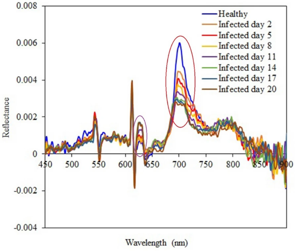 图9 健康猕猴桃和染病猕猴桃在450 ~ 900 nm范围内光谱反射率