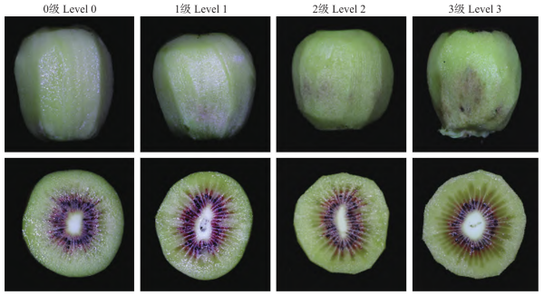 结合猕猴桃出库后的商业价值,将冷害分为4个等级,判别标准如下:0级为正常(未发生冷害);1级为极轻(0<可见病症≤1/4),不影响果实销售,仍具有商业价值;2级为较轻(1/4<可见病症≤1/2),失去部分商业价值,影响果实销售;3级为严重(1/2≤可见病症),不可食用,彻底失去商业价值。