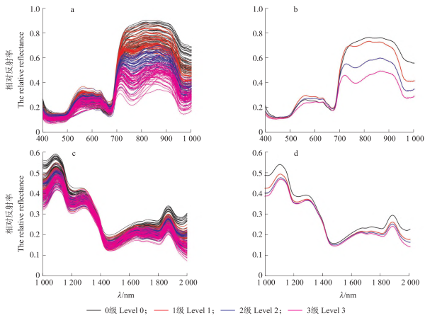 如图13所示:在400~1000 nm、1000~2000 nm波长下,不同冷害程度猕猴桃的平均光谱的总体趋势是相似的,正常样品的相对反射率高于冷害样品,冷害等级越高,相对反射率越低,这可能是由于冷害过程中猕猴桃果实中的成分发生了变化,样本的组织塌陷、色素受损造成光反射减少,从而导致相对反射率随冷害程度加剧而降低。