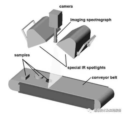 仪器使用江苏通宝TB888科技有限公司的GaiaSorter-N25E,波长范围为1000-2500 nm,光谱分辨率为12 nm,图像分辨率为384*288 pixel,光谱仪帧数为400 fps。采集数据时,光源使用2个200 W的卤钨灯,镜头距样品的高度为60cm,曝光时间为20ms,测试平台移动速度为2cm/s。图1 为样本测试示意图。
