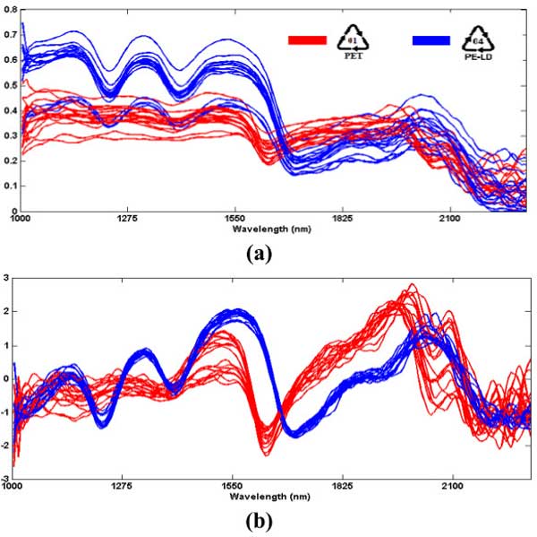 图3 PET and LDPE的光谱 (a) 预处理前, (b) 预处理后