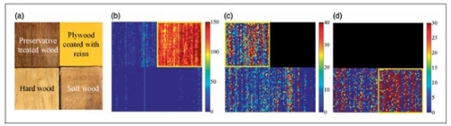 图1. 四种木材废料的RGB图像和由每个分类模型计算的伪彩色图像:(a)四种木材废料的可见光图像;(b)涂树脂胶合板分类的得分图像;(c)防腐处理木材分类的得分图像;(d)软木分类的得分图像