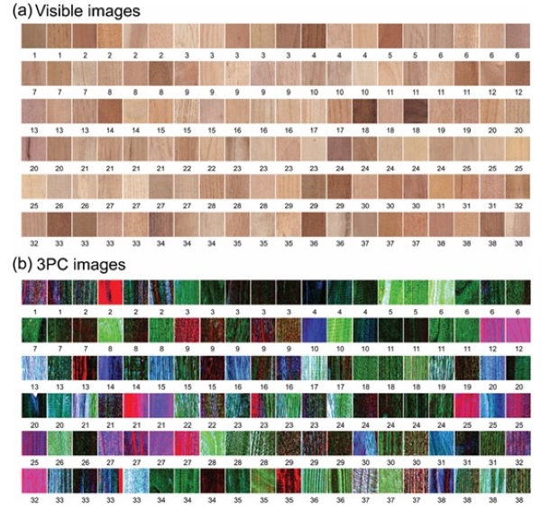 Kanayama等人(Kanayama et al., 2019)提出了一种基于NIR-HSI和卷积神经网络(CNN)的木材种类识别方法。作者通过对38种硬木的120个样品进行高光谱成像(波长范围为913-2519 nm),结合标准正态变换(SNV)***光散射影响,并使用主成分分析(PCA)提取光谱特征(图2),生成的主成分图像作为CNN模型的输入。实验表明,该方法在6个主成分图像的基础上,木材种类识别的准确率达到90.5%,显著高于基于RGB图像的56.0%。