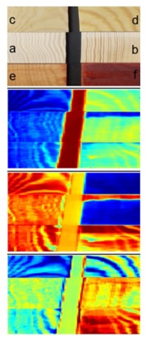 图4. 原图(第1幅图)和主成分分析(PCA)处理后的高光谱图像。分别为***主成分(第2幅图)、第三主成分(第3幅图)和第四主成分(第4幅图)。图像展示了不同处理方式下的木材样本,包括:干燥未处理松木(a)、潮湿未处理松木(b)、干燥硼盐处理松木(c)、潮湿硼盐处理松木(d)、干燥甲基托布津处理松木(e)以及潮湿甲基托布津处理松木(f)