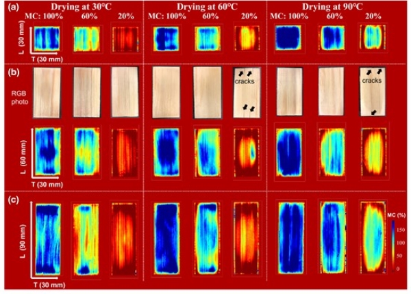 Ma等人(Ma et al., 2022)利用NIR-HSI技术分析木材干燥过程中的水分传输动力学,探讨了木材中自由水和结合水的动态变化及其对干燥过程的影响。研究通过对不同长度(30 mm、60 mm、90 mm)的日本扁柏样品在不同干燥温度(30℃、60℃、90℃)下的含水率分布进行可视化分析(图5),揭示了木材水分在干燥过程中的迁移机制。