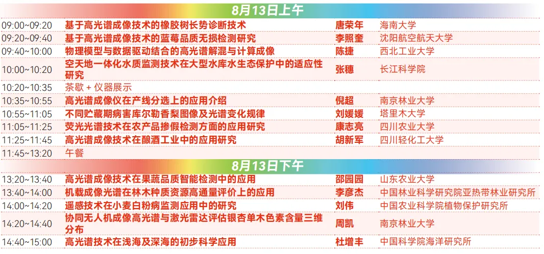 本次会议聚焦光谱成像新技术介绍、农业光谱遥感应用、光谱图像分析算法、食品光谱检测应用、林业光谱遥感应用、高光谱目标检测六个议题,涉及食品检测、植被遥感、分析检测、农业遥感、地质探矿、水体遥感、分析算法、工业应用、林业遥感、成像技术、海洋遥感等多个领域。会议以邀请学术报告为主线,其间穿插学术前沿展示和高端国产仪器展示,呈现出高光谱遥感技术的全新精神面貌。
