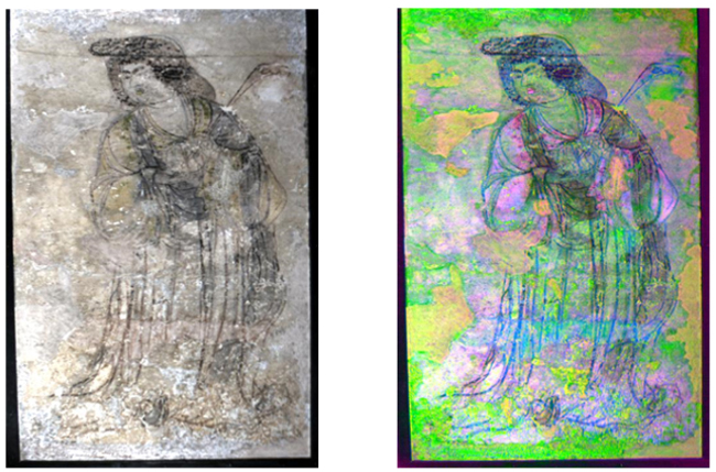 在古代,颜料多以矿物质、植物等自然物质为主,经过几千年智慧的积累,同一种颜色可以用不同的物质表达,比如红色就包括朱砂、赭石、铅丹等物质;黄色则可能是纤铁矿、密陀僧或雌黄等,所以即便看到同一种颜色,也无法立刻判断到底是哪种物质产生的颜色。高光谱成像仪获取的不再是可见光的图像,而是颜色光谱反射率的信息,所以不会产生普通相机在不同光源照射下呈现相同颜色的色差问题,进而完整且真实地还原色彩与壁画的状态。不仅如此,近红外波段到短波红外波段对颜料有穿透能力,这意味着高光谱成像仪可以透视壁画。