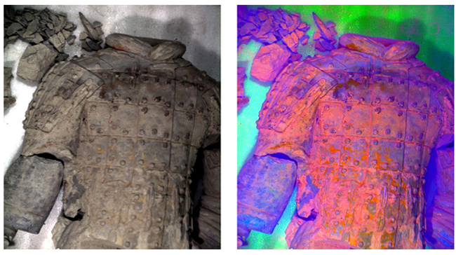 中国*一个皇帝秦始皇的庞大地下军团兵马俑,自1974年被发现以来,一直为全*界关注,被法国前总统希拉克誉为“世*第八大奇迹”。在地下沉睡了2200余年后的兵马俑重新面世时,几乎全部是“粉身碎骨”的状态。而且,包括兵马俑在内的这些埋于地下两千多年的珍贵文物,突然暴露在空气中,极易发生变化,其修复和保护工作也极为困难。高光谱成像技术通过非接触直接获取兵马俑的图像光谱信息,通过分析兵马俑的图像及光谱信息,可了解兵马俑被病害侵蚀程度以及兵马俑制造的颜料,最后根据分析结果对其进行模拟修复。