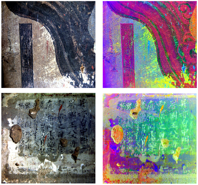 壁画是历史与艺术结合的产物,它从不同的侧面反映了各个历史时期的经济文化发展状况和意识形态,其文字信息有助于帮助考古学家深入了解历史的发展轨迹及分析早期文字的发展。斗转星移,这些精美绝伦的壁画及文字在自然、人为等多种因素的影响下,面临着起甲、脱落、发霉、变色、空鼓、酥碱等病害侵扰。高光谱成像仪分析采集壁画信息,是通过与壁画保持一定距离而进行非接触式扫描实现的。通过分析图像文字的轮廓及撰写文字的原料来快速提取壁画上的文字信息。