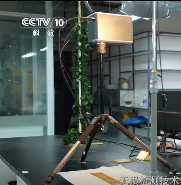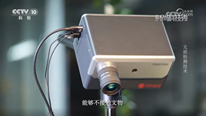 图2 CCTV10 报道北京服装学院民族服饰博物馆利用双利合谱高光谱成像系统对褪色、变形乃至破损的纺织品文物进行鉴定、修复