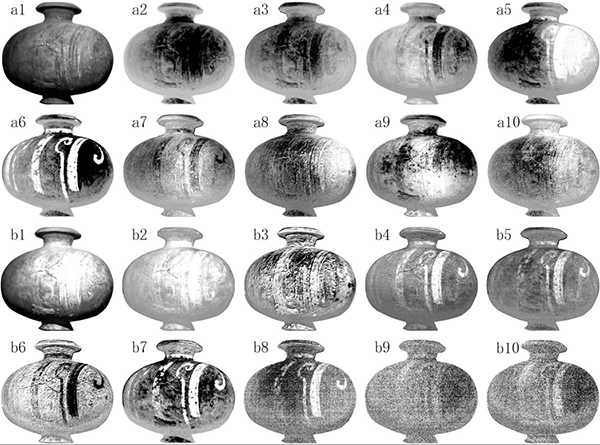 该研究提出一种自动挖掘彩绘文物图案的方法,采用最小噪声分率法获取主成分图像,利用显著性目标检测方法,得到彩绘文物图像,从而挖掘出其中的图案。下图2中前10个主成分图像分别通过MNF和PCA获得;MNF获得的第六主成分图像(a6)显示了*有效的显著信息;PCA获得的第七主成分图像(B7)显示了*有效的显著信息。结果表明,所提方法能自动、有效地挖掘人眼不易观察到的彩绘文物图案信息。