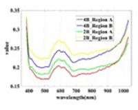 该研究以两幅相似素描画为样本,一幅用2B铅笔绘制,另一幅用4B铅笔绘制。利用地面高光谱成像仪分别获取390nm–1025nm范围内的高光谱数据,并对两幅画的光谱特征进行分析比较。对于左下图样本1,每个图像中选择了两个均匀区域,如下所示,每个区域在两张图像中的位置相同,它们的灰度级别基本相同,而右下图是每个均匀区域的平均光谱反射率曲线。结果表明,高光谱成像***地方便了获取绘画中不同材质的诊断光谱特征,通过高光谱分析可以有效地识别画作中的特定目标。同时,可以提取画作的直流特征和细节特征,有助于研究者分析画作的风格。