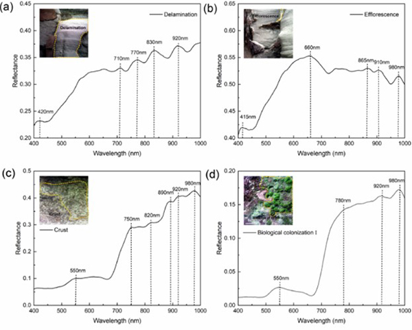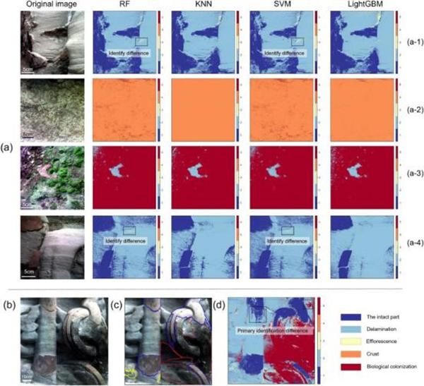 该研究基于高光谱图像,采用不同的算法建立了回弹值预测模型和劣化识别模型,并比较了不同波长选择方法和不同分类模型的效果。左下图利用400-1000nm的光谱曲线区分分层、风化(盐结晶)、生物定植和结皮。几种劣化的光谱曲线的吸收峰位置和数量存在明显差异;而右下图为砂岩文化遗产劣化类型的鉴定结果:(a)四种变质类型的算法的识别结果;(b)现场立柱的原始图像;(c)CAD统计对劣化类型的识别结果;(d)LGBM模型的恶化类型鉴定结果。最终结果表明,通过530nm和675nm波长构建的归一化光谱指数可以初步识别不同类型的劣化。此外,基于高光谱成像纹理特征的四种分类模型均能识别不同类型的劣化。