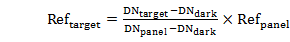 其中,Reftarget为目标物的反射率,Refpanel为标准参考板的反射率,DNtarget为原始影像中目标物的的数值,DNpanel为原始影像中标准参考板的数值,DNdark为成像光谱仪系统误差。