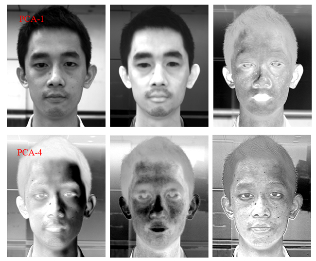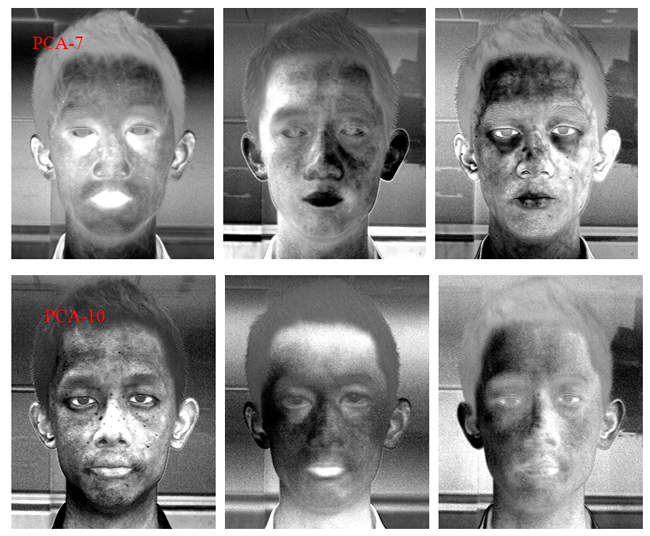 在本研究中,由于人脸在不同波长下成像,得到几百景人脸图像,且在不同的波长下人脸的灰度图像显示效果并不同,有的图像清晰,有的图像模糊,还有些基本上看不见。如果用计算机处理,会因为图像信息量太大而难以处理,浪费时间过多。所以,需要经过主成分分析法筛选出特征图像。主成分分析(Principal Component Analysis, PCA)的作用是去除波段之间的多余信息、将多波段的图像信息压缩到比原波段更有效的少数几个转换波段下。图10分别展示了人脸经主成分变换后的15个主成分图像,从图10可知,前2个主成分虽然包含了较多信息,且图像较为清晰,但黑痣的显示效果并不理想。从图10中我们可以发现,第4、6和10主成分能较为清晰地人脸黑痣的分布情况。