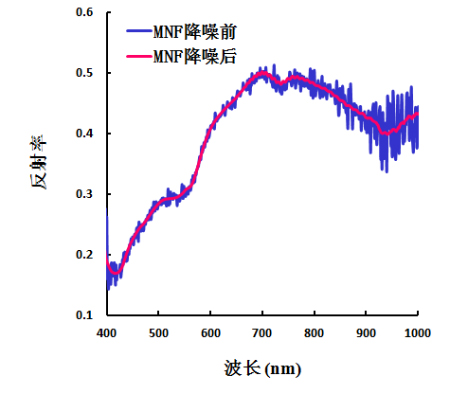 其次是噪声去除,本文运用国外较为常用的最小噪声分离方法(Minimum Noise Fraction Rotation, MNF)进行噪声去除。最小噪声分离工具用于判定图像数据内在的维数(即波段数),分离数据中的噪声,减少随后处理中的计算需求量。MNF本质上是两次层叠的主成分变换。第一次变换(基于估计的噪声协方差矩阵)用于分离和重新调节数据中的噪声,这步操作使变换后的噪声数据只有最小的方差且没有波段间的相关。第二步是对噪声白化数据(Noise-whitened)的标准主成分变换。为了进一步进行波谱处理,通过检查最终特征值和相关图像来判定数据的内在维数。数据空间可被分为两部分:一部分与较大特征值和相对应的特征图像相关,其余部分与近似相同的特征值以及噪声占主导地位的图像相关。图6为MNF降噪前后的光谱反射率变化。