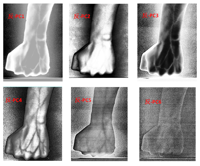 为了客观地识别手臂上的静脉,对经预处理后的高光谱数据进行主成分分析(Principal Component Analysis, PCA),去除波段之间的多余信息、将多波段的图像信息压缩到比原波段更有效的少数几个转换波段下。图9为手臂正反面经PCA变换后的前6个主成分。