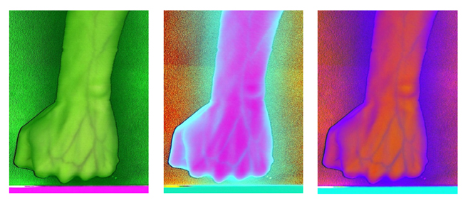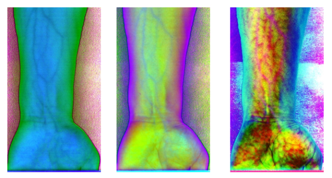 为了更客观真实地识别出手臂静脉,根据波段组合的特点,对PCA前六个主成分组合成各种假彩色图像,如图10为手臂正面的假彩色合成图像,图11为手臂反面的假彩色合成图像。与灰度图相比,假彩色合成更能直观地识别出手臂静脉。