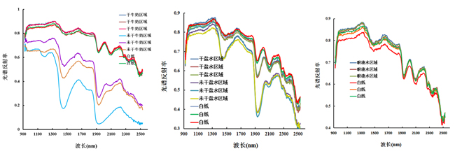 对获取的高光谱图像数据进行黑白帧校正得到图像的光谱反射率数据,同时对反射率数据进行坏点(NAN)进行修复,剔除掉异常值,从而得到牛奶、饱和盐水、眼液及背景(白纸)的光谱反射率数据,如图2所示。从图2可知,干牛奶与未干牛奶,其在白纸上写的字迹光谱反射率差异较大;当牛奶晒干后,字迹的光谱反射率与白纸十分相似,变化规律也趋向一致,对光谱进行放大分析可知,牛奶字迹的光谱反射率总体上高于白纸的光谱反射率。对于饱和盐水字迹而言,干饱和盐水字迹与未干饱和盐水字迹在光谱反射率上差异较为明显,特别是在水汽吸收带1420 nm和1910 nm附近差异更为显著;当饱和盐水晒干后,饱和盐水字迹的光谱反射率与白纸的光谱反射率变化趋势一致,但是白纸的光谱反射率高于饱和盐水字迹的光谱反射率。运用眼液在白纸上写上字,待眼液晒干后,去牛奶字迹、盐水字迹一样,肉眼无法识别出是什么字,利用短波红外相机测试其光谱反射率发现,眼液晒干后,其字迹的光谱反射率与白纸的光谱反射率变化趋势依然一致,但是眼液字迹的光谱反射率高于白纸的光谱反射率。