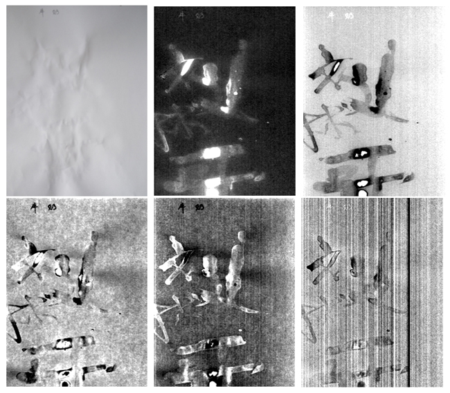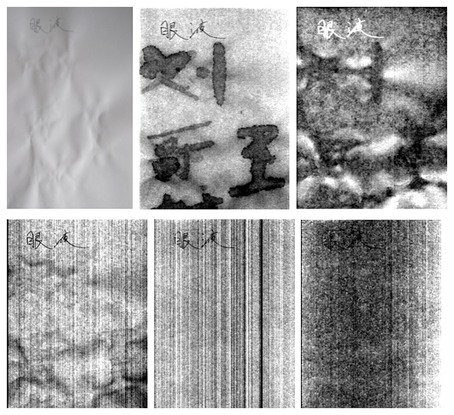 图5列举了眼液隐形字原图(手机拍摄)、MNF变换前5个成分。从原图中依然无法看到隐形字迹,但经过MNF变换后,第1成分能较好地识别出隐形字迹,第2、3、4、5以及往后的成分均无法识别眼液书写的字迹。