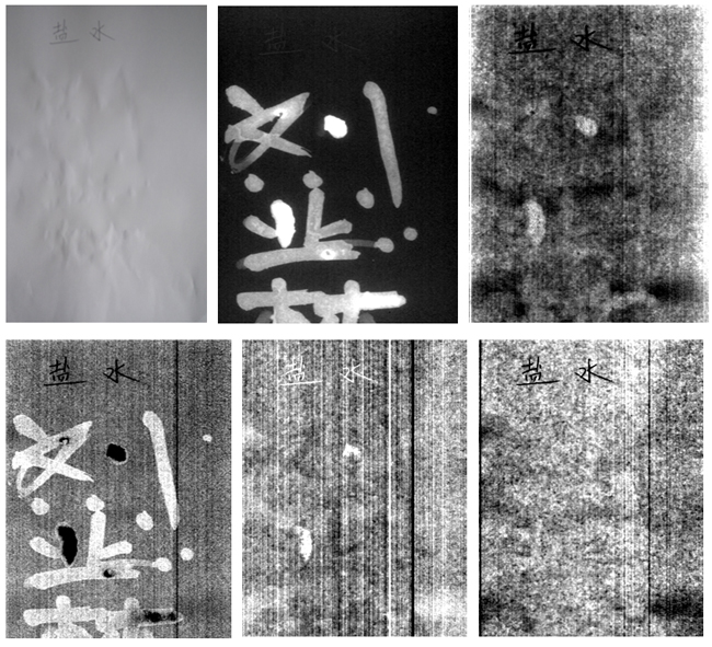 图4列举了饱和盐水隐形字原图(手机拍摄)、MNF变换前5个成分。从图中可知原图看不到字迹模样,但经过MNF变换后,第1、3成分能较好地识别出隐形字迹,其中第1成分隐形字迹识别效果最佳。第2、4、5以及往后的成分均无法识别出饱和盐水的字迹。第1成分中隐形字较亮的部分和第3成分隐形字较暗部分是因为牛奶尚未完全风干的原因,从图2可知干饱和盐水区域和未饱和盐水区域的光谱反射率曲线差异较为显著。