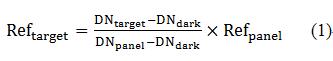 其中,Reftarget为目标物的反射率,Refpanel为标准参考板的反射率,DNtarget为原始影像中目标物的的数值,DNpanel为原始影像中标准参考板的数值,DNdark为成像光谱仪系统误差。