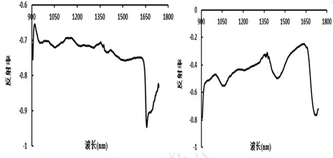 图5分别列举了砾岩高光谱影像中两像元点随水渗入时间的光谱反射率变化规律,从图5可知,随着水渗入时间的推移,虽然砾岩的像元点光谱反射率高低不太相似,但是呈现变化规律一致。图7则分别分析砾岩高光谱影像中两个像元光谱反射率与水渗入时间的相关性,其中左边为红色像元点,右边为绿色像元点的相关性分析图。从图7可知,砾岩高光谱上的不同像元点,其波段相关性与水渗入有着显著差异,但是相关性的变化趋势及最相关波段的范围与相关系数等相似。