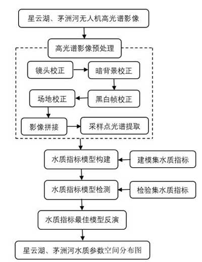 本研究以云南玉溪市星云湖和深圳市茅洲河为研究区,利用无人机高光谱技术构建水质参数如总氮、总磷、悬浮物、浊度、叶绿素a的监测模型,将最优的监测模型反演到无人机高光谱影像上制作总氮、总磷、悬浮物、浊度、叶绿素a的空间分布图。具体计算路线如图2所示。