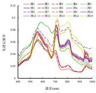 图3为星云湖和茅洲河共20个采样点的光谱反射率曲线,其中星云湖的5个采样点简称湖+数字,茅洲河的15个采样点简称河+数字。从图可以看出水体的光谱特征变化:在400-590nm范围内,水体的光谱反射率呈上升趋势,在570-590nm附近形成一个反射峰,是由叶绿素和胡萝卜素吸收较弱以及水中藻类和悬浮物的散射作用形成的;在590-680nm范围内,水体的光谱反射率曲线呈下降趋势,在670-680nm范围内形成一个峰谷,这是由于叶绿素a的强吸收引起的;在690-710nm范围内形成的陡峰可作为水体有无叶绿素的重要依据,由于浮游植物色素的荧光效应,使得水和叶绿素 a的吸收系数之和在此波长处达到最小值;在790-810nm范围内形成的峰值是由于水中悬浮物的散射作用引起的。综合分析星云湖和茅洲河采样点的光谱曲线可知,不同区域、不同水质的光谱曲线变化趋势总体一致,是不同采样点由于所含的水质参数含量不同,其峰谷值及曲线高低变换缓慢不同。