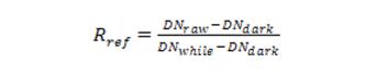 在进行高光谱图像采集时,需要设置相机曝光时间,平台移动速度以及物镜之间的距离。这 3 个参数相互影响,图像调节的目的是使采集的图像大小合适,清晰,不变形失真。经过反复尝试,物镜高度设置为 31 cm,曝光时间设置为10ms,平台移动速度分别设置为 4.8 mm/s(400-1000 nm)、14mm/s(1000-2500 nm)。图像采集软件采用江苏通宝TB888科技有限公司提供的高光谱成像系统采集软件完成。图像处理采用 ENVI5.3 软件进行处理。在进行图像处理之前,先要对采集的光谱图像进行图像校正,图像校正公式如下: