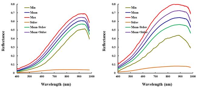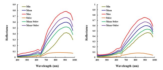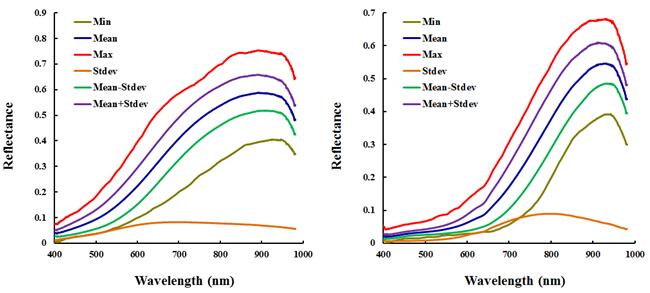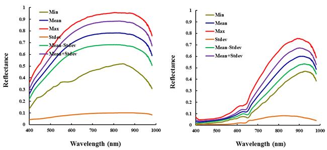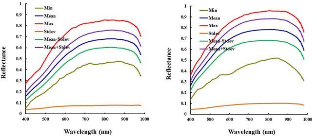 图3 新会2013年(左图)和2014年(右图)陈皮外层高光谱反射率(400 nm-1000nm)