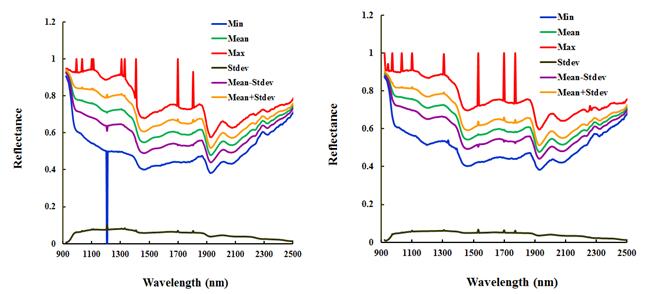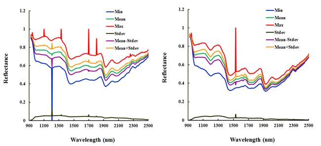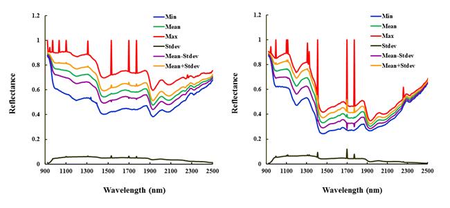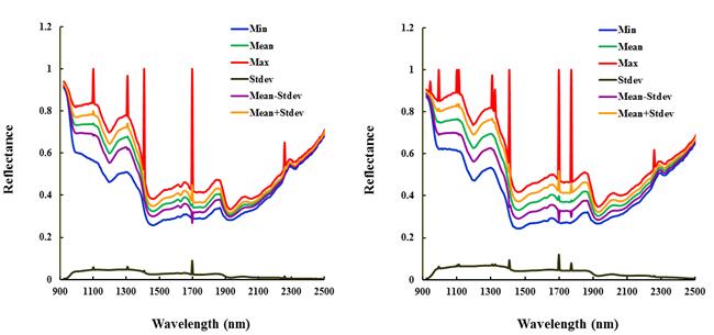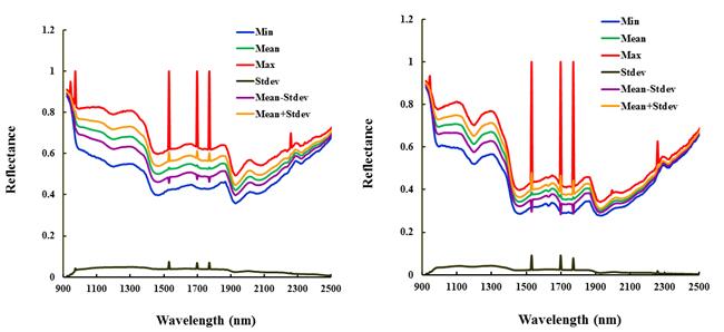 图4和图5为新会2013年和2014年陈皮里外层部分在1000 nm-2500nm范围内的光谱反射率的最大值、最小值、均值、方差、均值±方差曲线。