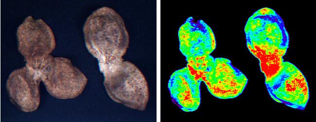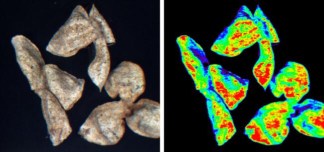 图8为新会市2013年和2014年陈皮里层的RGB合成图(R:640 nm,G:550 nm,B:460 nm)和主成分分析的第一主成分的分类图。从图8(a)2013年新会市陈皮内层的分类图可知,红色区域为无霉斑区域,蓝色区域和绿色区域为霉斑区域。从图8(b)2014年新会市陈皮内层的分类图可知,红色区域和绿色区域为无霉斑区域,蓝色区域为霉斑区域。