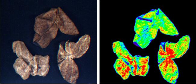 图9为不同产地不同年份陈皮里层的RGB合成图(R:640 nm,G:550 nm,B:460 nm)和主成分分析的第一主成分的分类图。其中图9(a)为1991年江门市陈皮内层的RGB合成图和主成分分析的第一主成分的分类图,图9(b)为2002年某市陈皮内层的RGB合成图和主成分分析的第一主成分的分类图,从这两图可知红色区域为无霉斑区域,蓝色区域和绿色区域为霉斑区域。图9(c)2014年新会市陈皮内层的分类图可知,红色区域和绿色区域为无霉斑区域,蓝色区域为霉斑区域。