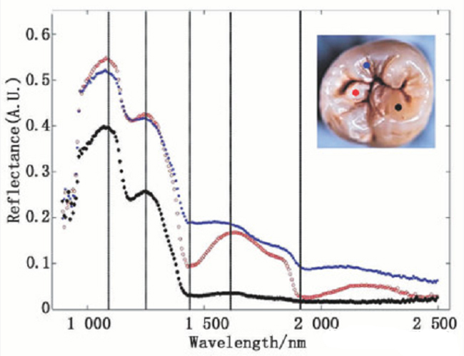 图2 牙齿表面的近红外光谱反射率曲线(红色表示病变区域,蓝色表示损伤区域,黑色为健康区域)